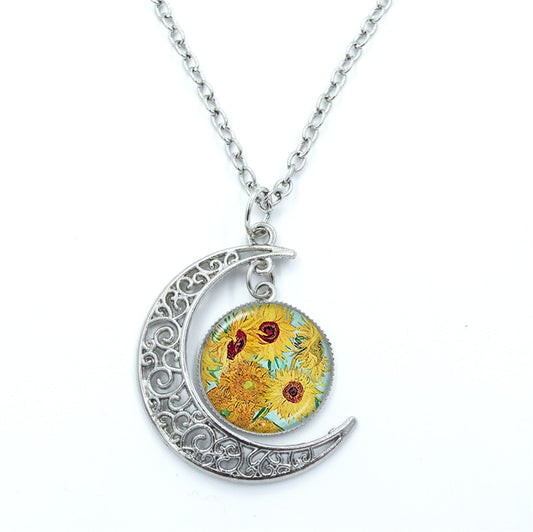 Van Gogh Starry Night Necklace Glass Cabochon Crescent Moon Chain Necklace Jewelry. Gift For Women