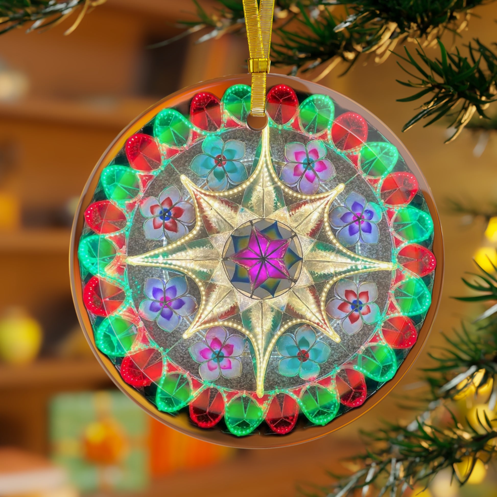 customizable glass ornament. It comes with a gold-colored ribbon so you can hang it anywhere around the home. It will look as much in place on a wall or by a window as it will in a Christmas tree.