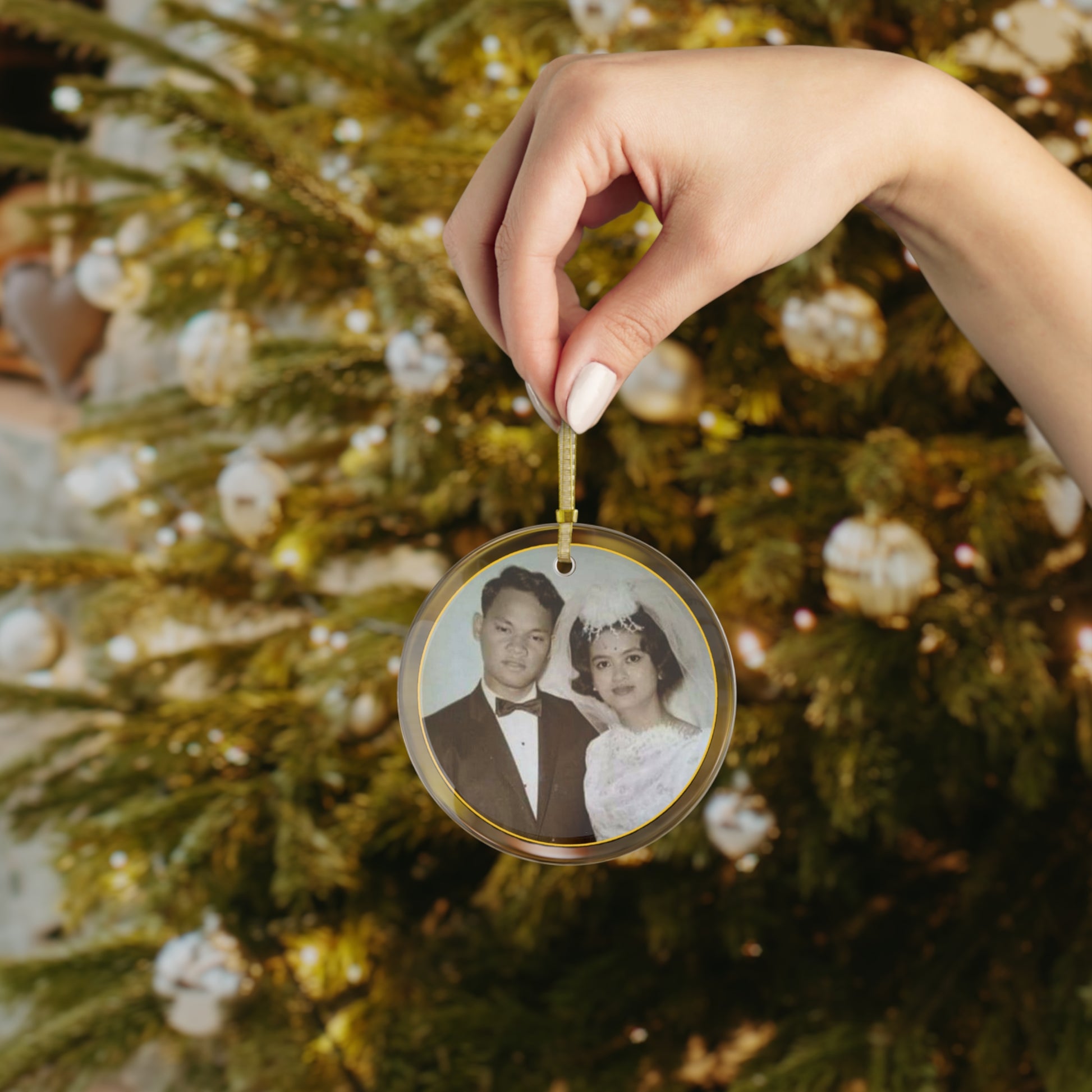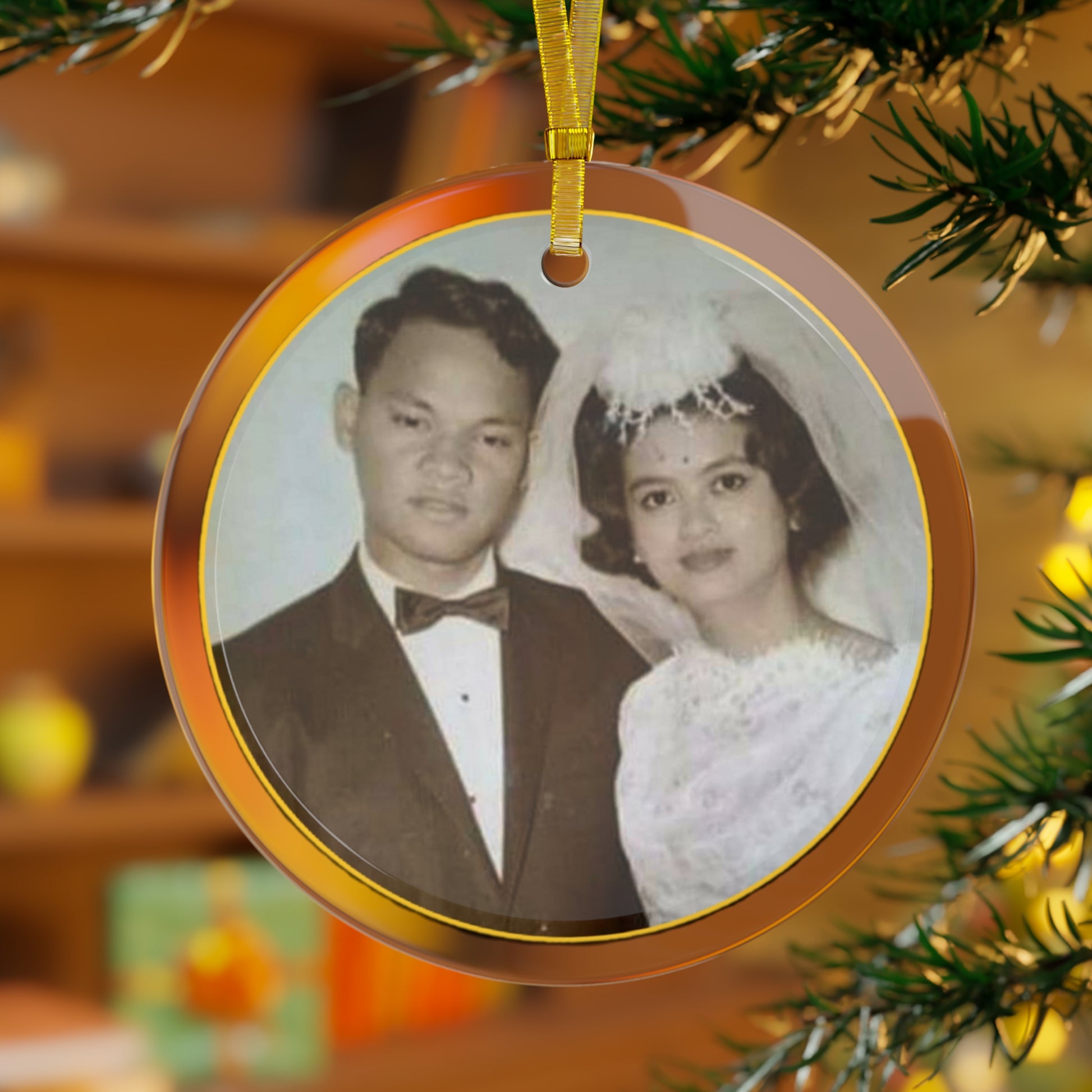 Message seller to fully customize with your own design. Adding a personalized touch to your home with this customizable glass ornament. It comes with a gold-colored ribbon so you can hang it anywhere around the home. It will look as much in place on a wall or by a window as it will in a Christmas tree.