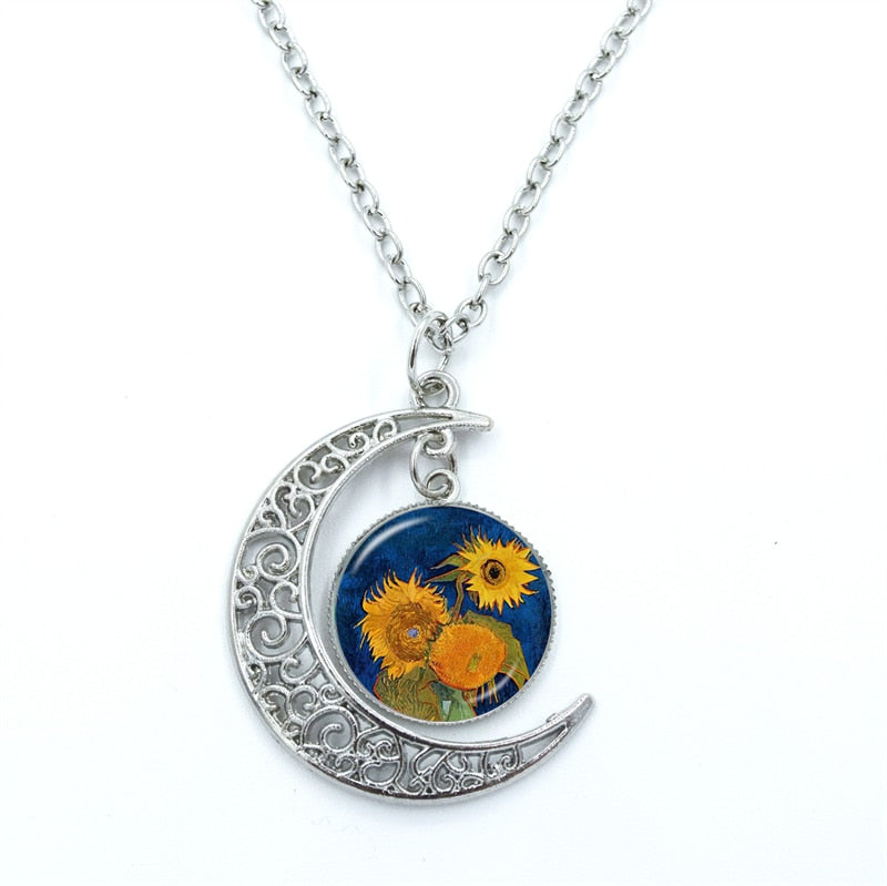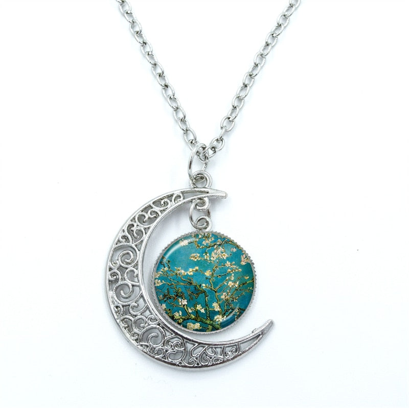 Van Gogh Starry Night Necklace Glass Cabochon Crescent Moon Chain Necklace Jewelry. Gift For Women